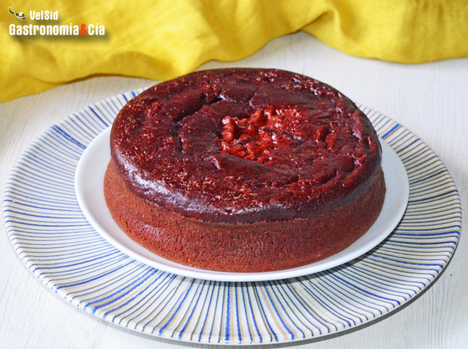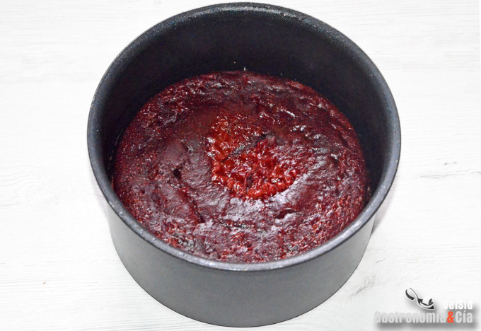Comprueba si el bizcocho está hecho pinchando con una brocheta o palillo, puede necesitar 5 minutos más, destapado y a 160º C. Cuando esté listo el bizcocho para hacer la tarta Red Velvet saludable, déjalo enfriar antes de desmoldar.