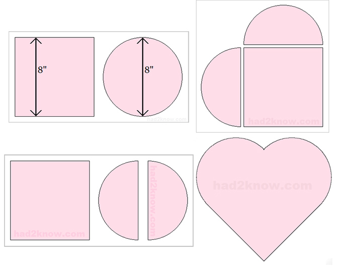 Las imágenes lo dicen todo, el pastel cuadrado se coloca en posición de rombo, el bizcocho redondo se corta por la mitad y cada mitad se coloca sobre un lado superior del rombo, éstos se pueden unir con alguna crema de pastelería, y ya tenemos la forma del corazón.