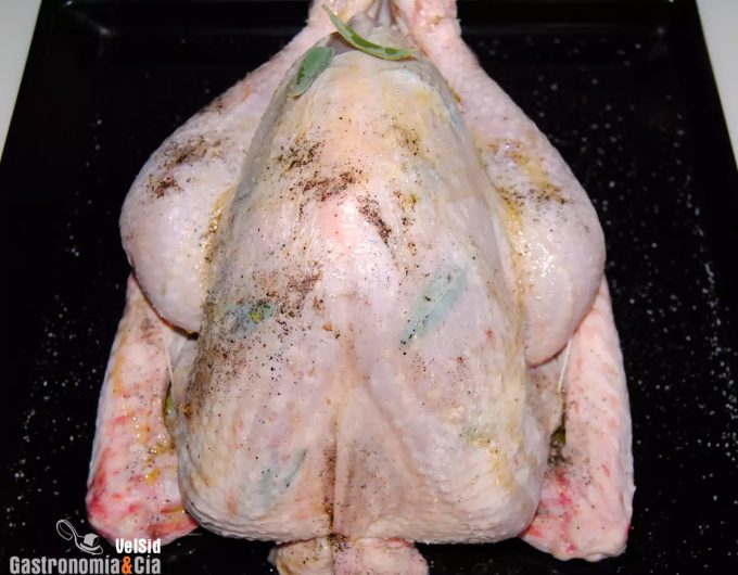 Para favorecer que las pechugas queden jugosas (los muslos como tienen más grasa siempre quedan más jugosos), se puede optar por iniciar la cocción del pavo colocando el ave con las pechugas hacia abajo, en contacto con la bandeja, así se retrasa su calentamiento y cocción, después se da la vuelta al ave para que se dore por la parte más vistosa.