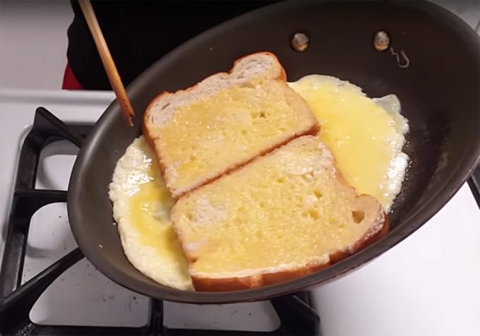 Pues ya habéis visto cómo se hace el sándwich con tostadas francesas relleno de tortilla de queso, en primer lugar se vierten los huevos batidos en la sartén previamente engrasada, después se colocan las dos rebanadas de pan sobre el huevo batido que aún no ha cuajado y se les da la vuelta para que queden impregnadas por los dos lados, de ahí que se hable de tostadas francesas, pues como el pain perdu o las torrijas, se elaboran mojando el pan en huevo batido.