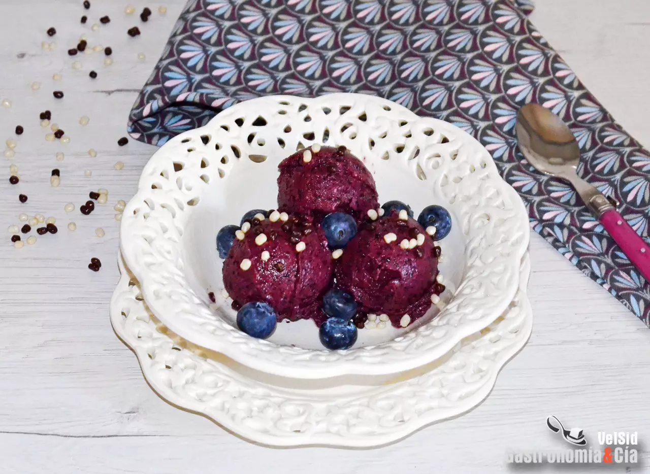 En principio, este sorbete o helado de fruta y yogur instantáneo no es para servirlo en bolas, sino como un yogur helado, pero si lo dejas un rato en el congelador y se endurece, se podrán hacer bolas con una cuchara para helados fácilmente. Una vez servido el helado de arándanos y yogur en un bol o tarrina, puedes decorarlo con fruta fresca, con bolitas de chocolate crujientes, con sirope, con una galleta de helado… También puedes servirlo en un cucurucho. ¡Buen provecho!