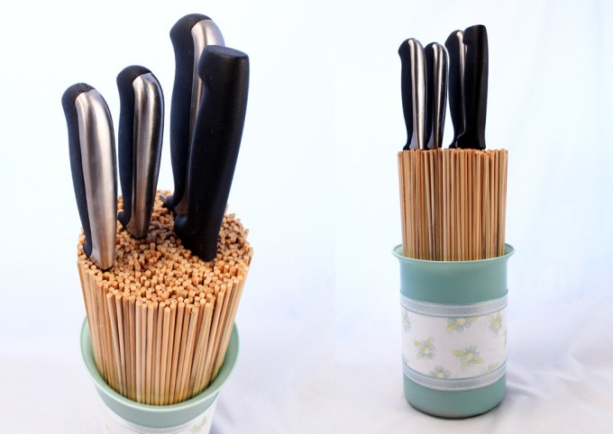 Pero para dejar de gastar los 59 euros que cuesta, nada mejor que hacerse con un tarro de cerámica, de cristal o del material que se desee, puede ser redondo, cuadrado, triangular o como se os antoje. Además es necesario comprar unos cuantos paquetes de brochetas de madera o bambú y poco más, lo que se quiera utilizar para decorar el tarro convertido en un portacuchillos.