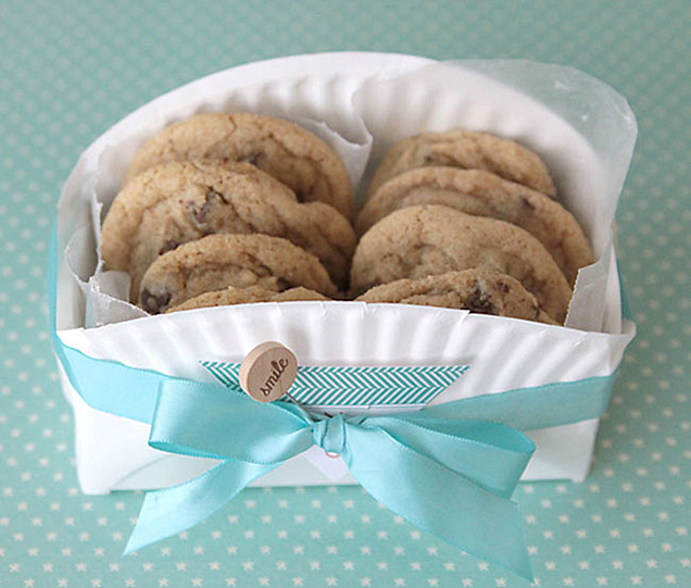 En el mercado hay un amplio catálogo de cajitas decoradas para todo tipo de galletas, cupcakes y otros pastelitos, pero si se quiere reducir el gasto y disfrutar de las manualidades, se pueden hacer cajitas para galletas en cinco minutos utilizando platos de papel, un poco de celo y un lazo. A continuación podéis ver cómo.