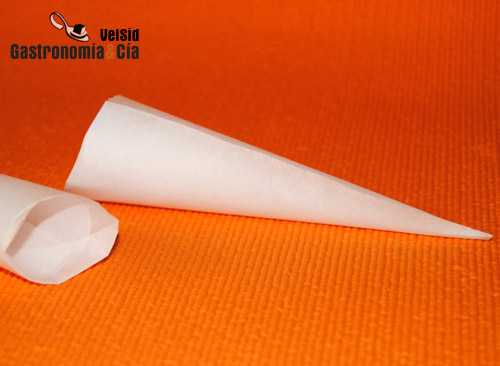 Una vez que disponemos del triángulo de papel, lo sujetamos con la punta hacia abajo, llevamos al centro un lateral y a continuación traemos el otro lateral sobre el primero, formando el cono y presionando (enroscando) para cerrar la punta del cono y poder rellenar sin que se salga el ingrediente, después se practicará un corte para ello.