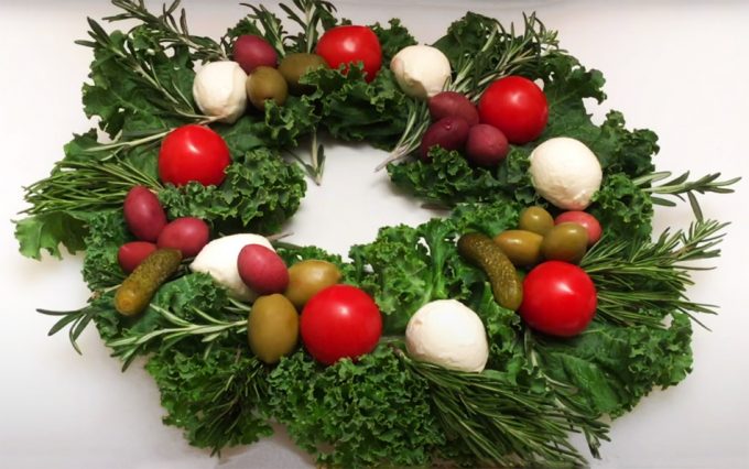 Bajo estas líneas os dejamos el vídeo que hemos encontrado en el canal de YouTube de ‘1 Recette 1 Minute’, titulado ‘Aperitivo de corona navideña’ y en sólo 49 segundos nos muestra cómo hacer una sencilla corona de Navidad comestible para decorar la mesa estas fiestas. En este caso, como elemento verde imitando las ramas de pino o abeto, utilizan hojas frescas de col rizada o kale y ramitas de romero. Claro, las ramitas de romero seguirán siendo un elemento decorativo, pues no son para comer así, a bocados.