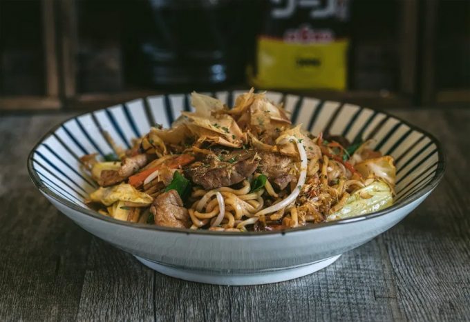 Se saltea el conjunto un minuto más y el yakisoba de cerdo está listo para servir. Se puede coronar con copos de bonito seco (katsuobushi) y copos de alga nori (aonori). ¡Qué plato más apetitoso!
