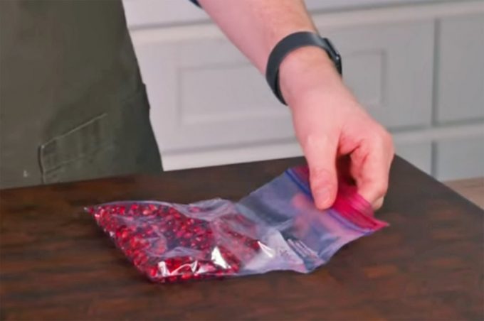 Entonces, ¿qué se necesita para hacer zumo de granada si no se tiene un exprimidor? Pues como veréis en las imágenes a continuación, basta una bolsa con cierre tipo Ziploc y algo para presionar, una mano de mortero, un rodillo, una espalmadera o simplemente una botella que haga las veces de rodillo.