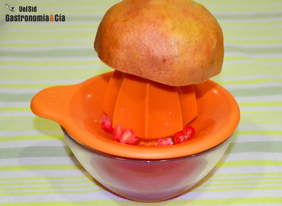 Se puede apurar bien la granada para obtener todo el zumo, aunque dependiendo de cómo esté de madura la pieza su piel se puede romper y habrá granos que se queden adheridos a ella y otros tantos en el exprimidor (para comerlos el cocinero). Pero probad a exprimir una granada si no lo habéis hecho así antes, personalmente nos parece una buena técnica para ahorrarse el tener que desgranar la granada y con un poco de cuidado apenas se ensuciará nada.