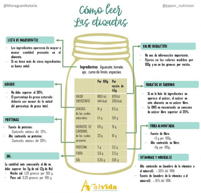 Para saber cómo leer las etiquetas de los productos alimenticios, estamos seguros de que os va a resultar útil la infografía que os dejamos a continuación, la han realizado las nutricionistas @MoraguesNatalia y @Japon_Nutricion, y como podréis ver, explican cómo se expresa la lista de ingredientes, en qué hay que fijarse de la tabla del valor energético, qué tener en cuenta sobre los macronutrientes tales como los hidratos de carbono, las proteínas, las grasas y sobre la fibra alimentaria, así como cuándo se trata de un producto con exceso de sal o si se puede considerar que tiene un alto contenido en vitaminas.