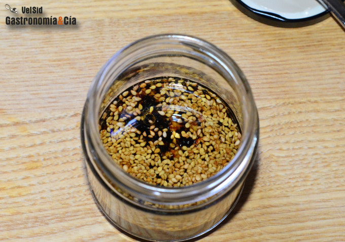 Pela y ralla el jengibre fresco y añádelo al recipiente. Tuesta las semillas de sésamo en una sartén sin engrasar, hasta que empiecen a crepitar y desprender su aroma a tostado, y retíralas, a continuación pásalas al recipiente en el que se está preparando la salsa.