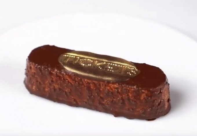Llega el momento de firmar el dulce, es decir, de poner el sello de Tickets o de Cakes & Bubbles, como se hace con muchos platillos de Albert Adrià. Lo hacen con chocolate y con un sello, y después lo pintan de dorado. Para terminar, se baña cuidadosamente el éclair de merengue con chocolate y se deja secar. Sin duda, un delicioso bocado, ¿os parece irresistible?