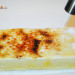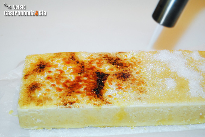 Tras este reposo, desmolda el turrón y cubre con la mezcla de yema de huevo y azúcar para tostarlo. Puedes hacerlo con una pala o quemador de azúcar tradicional, con el grill del horno o con un soplete de cocina. También puedes añadir un poco más de azúcar sobre la yema para que el caramelizado sea más rápido y crujiente.