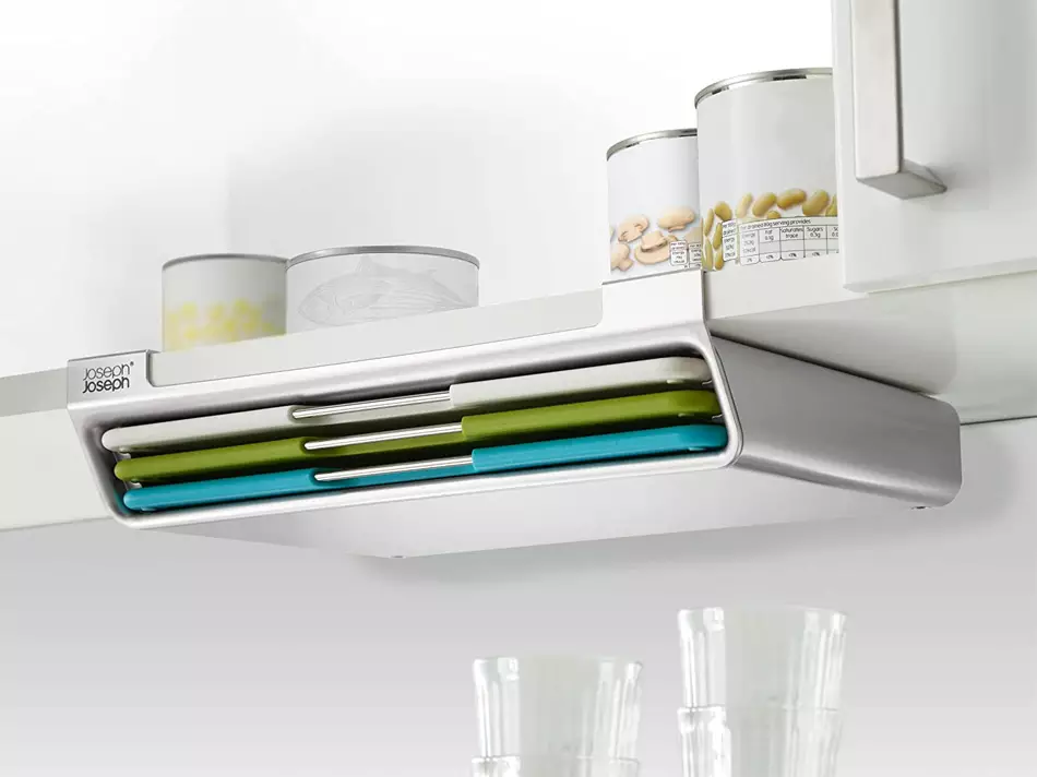 Y últimamente han estado desarrollando una línea de accesorios que se colocan en una repisa para obtener, de un espacio sin uso, un hueco más en el que ordenar desde especias a rollos de papel de aluminio, encerado, film… Pues bien, el nuevo utensilio de cocina de Joseph Joseph es una fusión de las dos cosas que hemos mencionado, y nos parece una buena idea para lo que os comentamos en el titular, cómo tener siempre a mano todas las tablas de cortar, sin que ocupen sitio en la encimera.