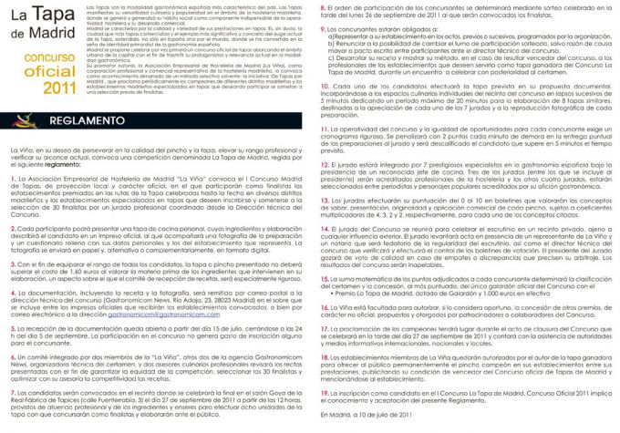 Tras la celebración durante los últimos años de la ruta gastronómica De Tapas por Madrid, evento organizado por la Asociación Empresarial de Hostelería de la Comunidad de Madrid La Viña, esta entidad, con el apoyo del Ayuntamiento de Madrid, la colaboración de cerveza Cruzcampo y la asistencia técnica de Gastronomicom News, ha creado el primer Concurso La Tapa de Madrid, un certamen que se celebrará el 27 de septiembre de 2011 en el salón Goya de la Real Fábrica de Tapices (calle Fuenterrabía, 3. Madrid).