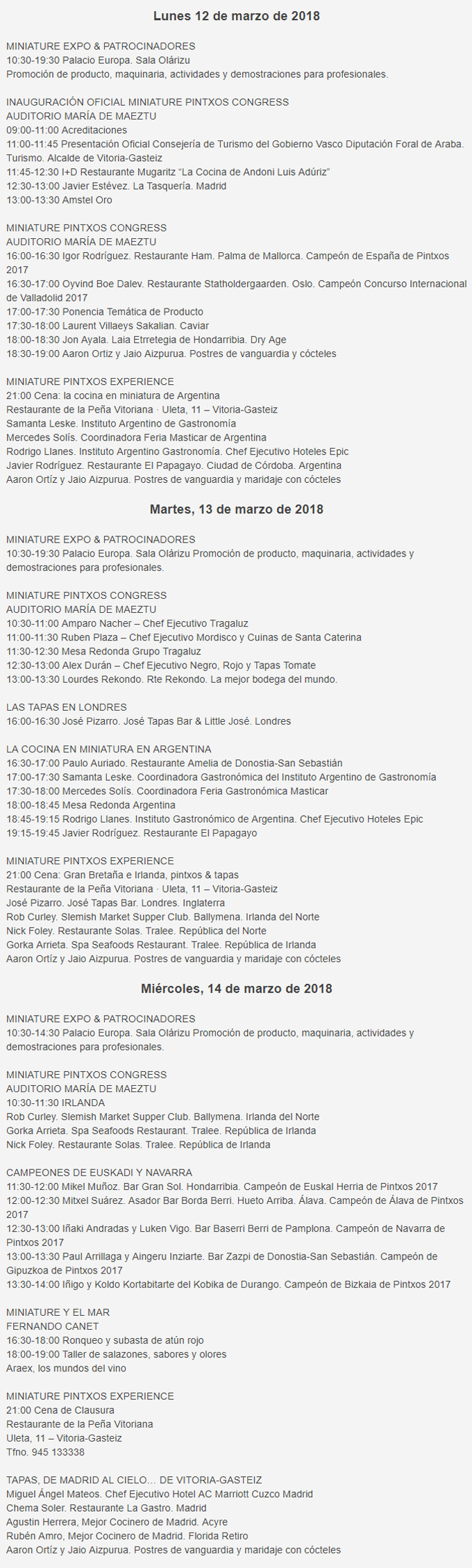 El Congreso de Pinchos Miniature 2018 se va a celebrar los días 12, 13 y 14 de marzo, aunque hay un programa de actividades bautizado como ‘Miniaure, Álava y sus gentes’ que se desarrollará bajo su paraguas del 8 al 11 de marzo, se presenta como un programa lúdico y social con actividades para todos, dichas actividades son: Miniature en Femenino, Miniature Iron Chef, Miniature Kids y Miniature, la barra más grande de pintxos.
