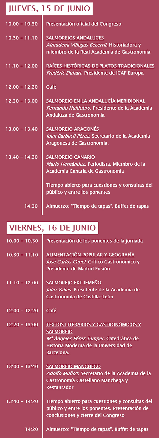 Para valorar la posibilidad de asistir a este congreso gastronómico centrado en el salmorejo de cualquier rincón de España, a continuación os dejamos el programa de ponencias con el nombre de los periodistas, gastrónomos, historiadores y demás profesionales que las impartirán.