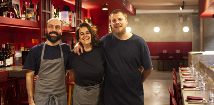 Morote, Puig y López, discípulos del Gresca, han instalado su proyecto profesional en un local con aspecto de clandestino. Respectivamente tutelan cocina, vinos y sala. Carlos domina el fuego, con caldos y fondos en la base de los platos, recurriendo a señas de identidad (vinagretas y escabeches) que evocan su pasado y aman la casquería. En la parte líquida, dominio de los vinos naturales, defendidos en la sala con amplio conocimiento, solvencia y talento.