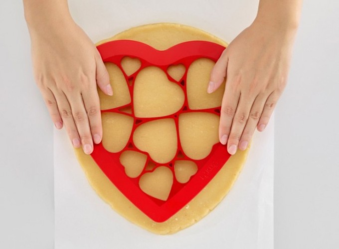 Este molde lo hace solo, ahora bien, los restos de masa del exterior se deberán aprovechar utilizando un pequeño cortapastas tradicional o dándole cualquier otra forma. El caso es que con un solo movimiento, o un solo corte de la masa, podréis hacer 12 galletas con forma de corazón de distintos tamaños.