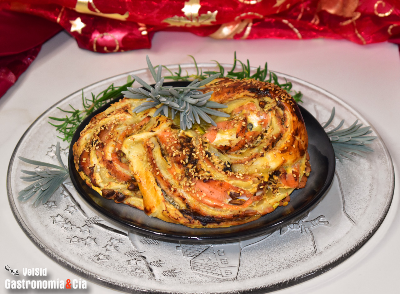 Cuando el horno alcance la temperatura, introduce la bandeja en el horno a altura media, hornea la corona durante 20-25 minutos, hasta que el hojaldre esté dorado.