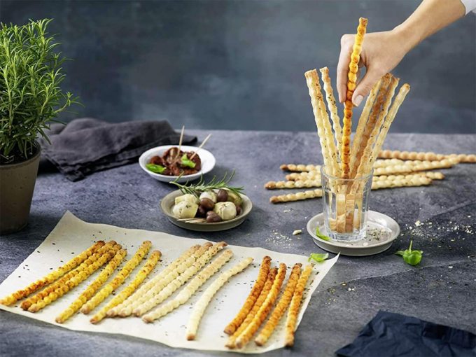 Por cierto, si no queréis esperar a una nueva receta, os recordamos que en el blog tenéis varias propuestas, a cuál más rica, como los grisines de aceite de oliva, los de semillas de sésamo y de lino, los de cerveza, los de pipas, los de cereales… Podéis ver las recetas de todos estos y más en este post. Y veréis también que nos gusta hacerlos fáciles, algunos estirados a mano y otros cortados con un cortapastas o con un cuchillo, y como entendemos que puede ser algo entretenido, hemos querido mostraros una alternativa que os encantará si os gustan los gadgets de cocina.