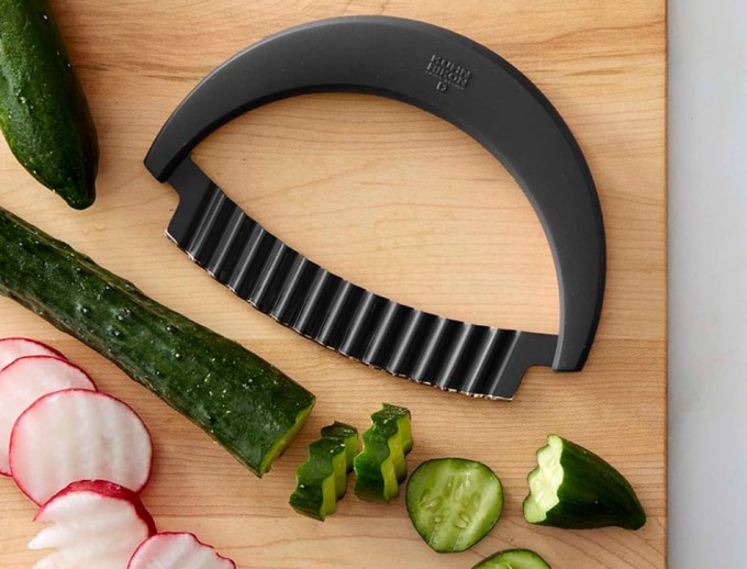 Sobre estas líneas podéis ver un nuevo modelo de cortador ondulado para vegetales, al menos no es el que estamos más acostumbrados a ver, aunque hay muchos modelos, tal y como os mostramos hace unos años en el post de los cuchillos decoradores, donde podéis ver siete utensilios de cocina diferentes y todos diseñados para cortar zanahorias, calabacines, pepinos, patatas, rabanitos, queso y muchos otros alimentos, dándoles una forma ondulada.