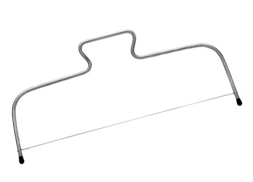 La lira para cortar bizcochos, tartas y pasteles es como la lira para cortar queso que podemos ver en los comercios donde nos venden el queso a granel, quizá algo más ancha (depende del fabricante), podéis verla en la imagen, es de gran tamaño, de unos 30-35 cm., y tiene una forma similar a la de un tirachinas, con el hilo de acero y la estructura de acero inoxidable.