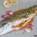 Añade también la pimienta blanca, el pimentón de la Vera y sal al gusto, mezcla bien y a continuación reparte el majado sobre el pescado y en su interior. Para terminar, añade un hilo de aceite de oliva virgen extra sobre la corvina e introduce la bandeja en el horno a altura media y programa 20 minutos.