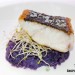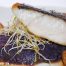 Sirve en la base del plato una cucharada de puré de patata violeta, coloca encima unos brotes de alfalfa y a continuación la corvina, presentando la piel hacia arriba y añadiendo unas escamas de sal. Reparte, si lo deseas, unos cascos de chalota y una vez que el plato está ante el comensal, vierte el caldo de chalota tostada al gusto. ¡Buen provecho!