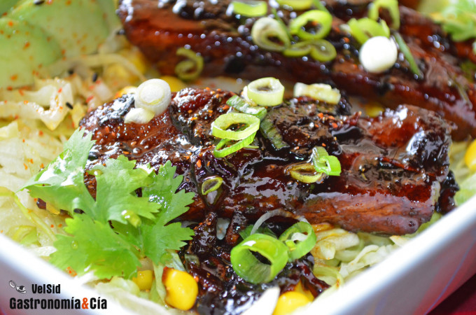 Puede parecer una redundancia decir que unas costillas glaseadas están para chuparse los dedos, y es que es evidente que después de coger con las manos esta preparación culinaria, y de que queden los dedos agradablemente pringados de su salsa, hay que chuparlos. Así que vamos a decir simplemente, que estas Costillas de cerdo ibérico con salsa teriyaki están exquisitas.