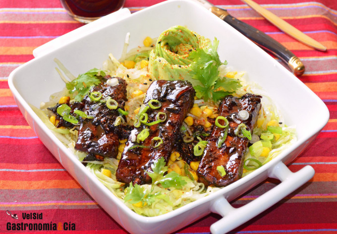 Dispón en los platos una base de lechuga con maíz dulce, adereza con un poco de sal, aceite de oliva virgen extra y aceite de sésamo. Coloca a un lado la rosa de aguacate y seguidamente las costillas ibéricas con salsa teriyaki. Reparte la cebolleta japonesa picada, el cilantro fresco, el shichimi togarashi. Reparte la salsa que haya quedado en la cazuela y sirve enseguida. ¡Buen provecho!