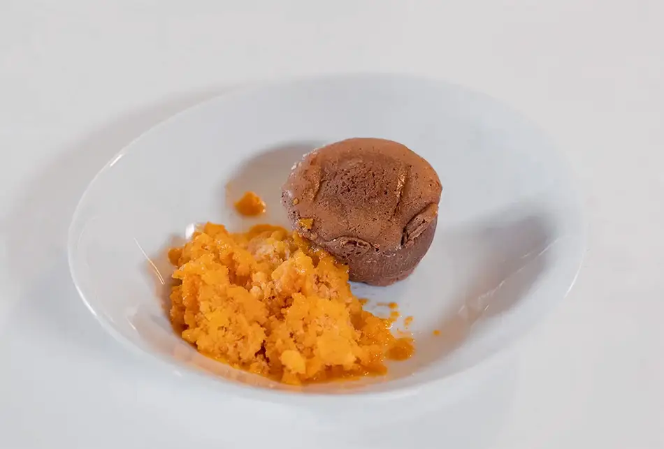 Sobre un plato de presentación desmoldar el ‘coulant’ de chocolate aún caliente, y rallar al momento el albaricoque congelado, dejándolo caer a un lado.
