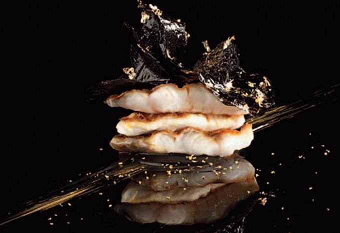 Tras retirar las espinas a los salmonetes, hacerlos a la brasa por la parte de la piel. Pintar una franja de oro en el plato, servir sobre ella la crema de arroz negro caliente. Acomodar los salmonetes sobre la crema y darle un toque de distinción con los pañuelos de arroz.