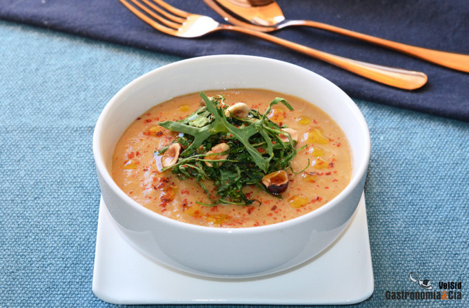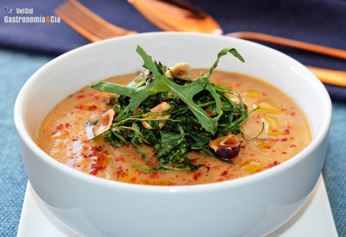 En esta ocasión le hemos dado a la crema un toque picante y ahumado con el chipotle en polvo, un condimento que se puede encontrar en tiendas de especias y en otros comercios bien surtidos. En su defecto, podéis utilizar pimentón de la Vera, y también podéis omitir este ingrediente si no queréis que tenga picante. En cuanto a la confitura de boletus, es comprada, pero también hay alternativa si no la tenéis. La idea es aportar el toque de la seta, pero no hace falta que sea dulce, así que podéis añadir boletus fresco o rehidratado, salteándolo con la chalota. Por lo demás, si tenéis alguna duda para hacer esta deliciosa crema de boniato, boletus, avellanas y rúcula crujiente, no dejéis de consultarnos.