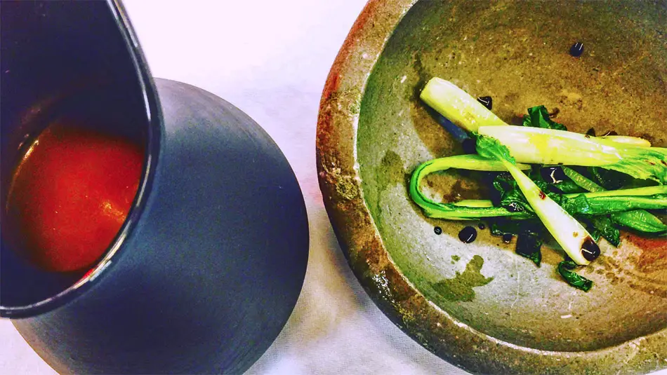 Emplatar las tiras de pak choi y los dados de arrope en un bol, servir en la mesa la crema caliente y terminar con unas gotas de arrope reducido.