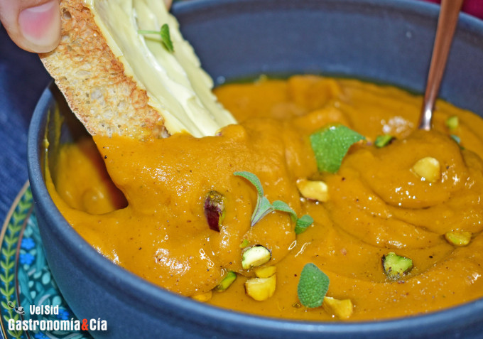 Os podéis imaginar que es una crema muy sabrosa, las verduras asadas dan este resultado, y sumando los condimentos y aromatizantes que añadimos, el resultado es espectacular. Pero no creáis que para conseguirlo vais a tener que dedicar mucho a la cocina, esta receta de crema de calabaza es muy fácil, muy sencilla de preparar, se asan las hortalizas (lleva boniato, zanahoria, chalotas, ajos…), y después es cuestión de condimentar y triturar. El pan tostado con mantequilla ahumada para acompañar es un capricho delicioso, así que si podéis disfrutadlo, no os cortéis.