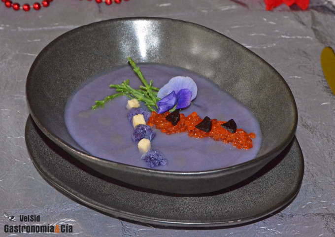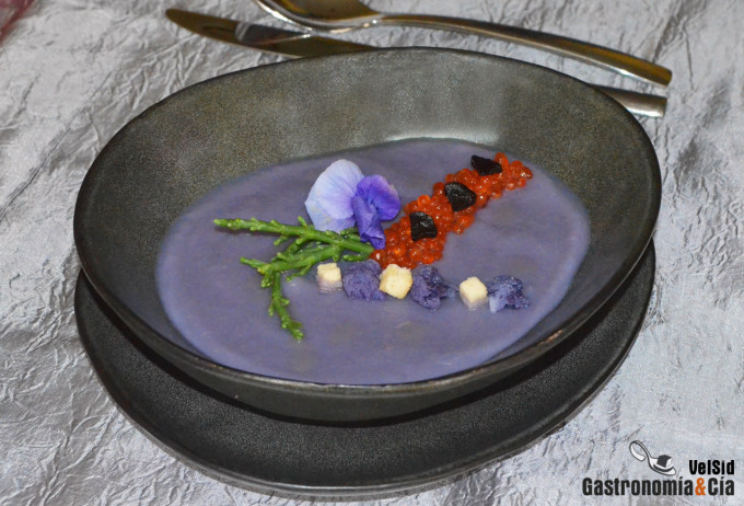 A pesar de que esta crema no lleva pescado como tal (lleva las huevas de trucha, de piscifactoría), tiene un sugerente y delicioso sabor a mar, y es gracias a la salicornia, también denominada espárrago de mar. También las huevas de trucha aportan su toque en cuanto a sabor, y sobre todo en cuanto a textura, es exquisita la sabrosa explosión que se produce en el paladar durante la degustación. En general, es un plato sencillo pero muy rico organolépticamente hablando, además, esta crema de coliflor morada con salicornia, huevas y ajo negro es nutritiva y saludable, ideal para las comidas de Navidad.