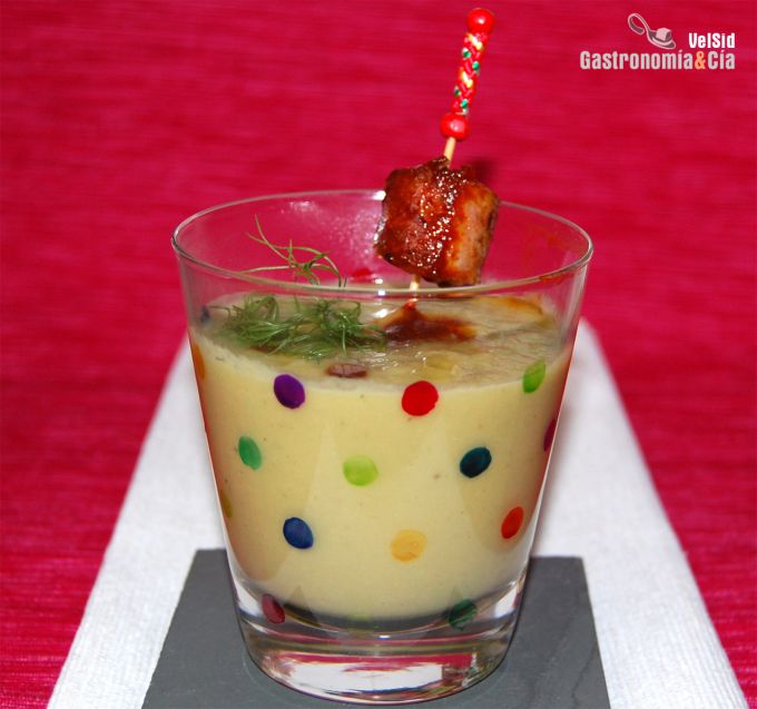 Corta la butifarra en rodajas gruesas y ensártalas en unas brochetas con una longitud adecuada para los vasitos o los cuencos en los que vayas a servir la crema.