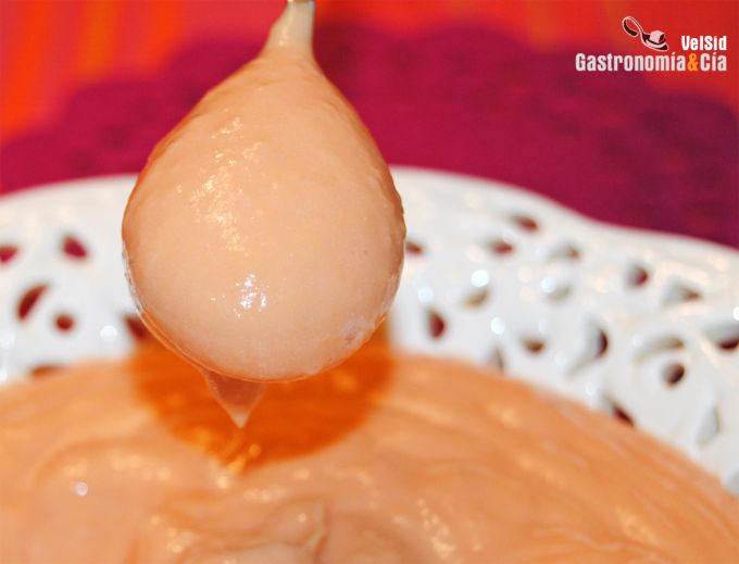 Este color rosadito-salmón es el que presenta la Crema de naranja sanguina que hemos preparado para hacer algunos postres que pronto os mostraremos. No es como la crema de naranja o crema de limón (lemon curd), es más del estilo de una crema pastelera, el vivo color del zumo de naranja sanguina se ve suavizado por la incorporación de leche en polvo.