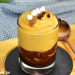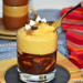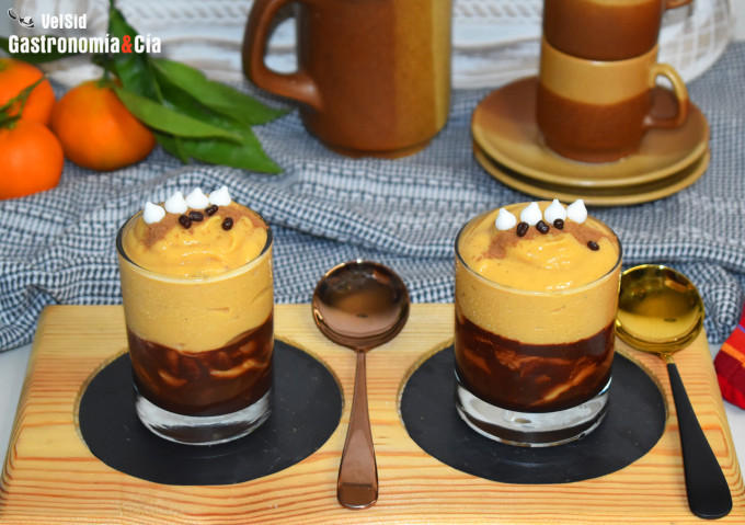 Vierte la crema de calabaza y tofu sedoso con especias dulces en los vasos y decora como te apetezca, desde un poco de especias, a un poco de chocolate rallado, bolitas de chocolate crujiente, galleta troceada, nata, merenguitos…