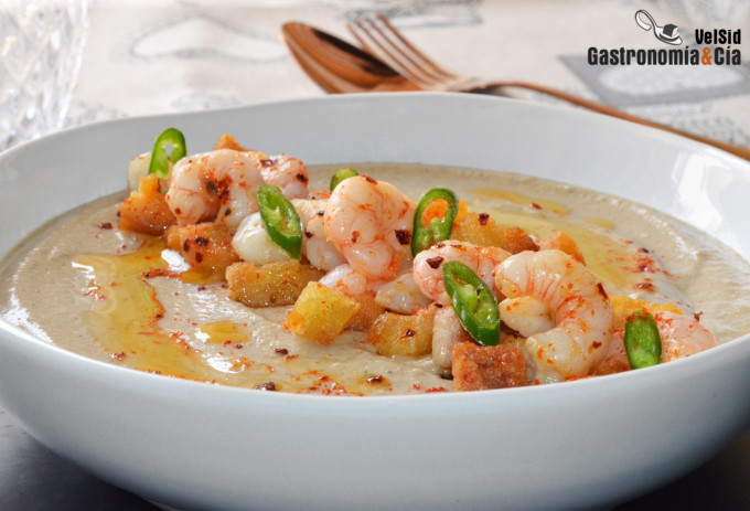 Sirve la crema de berenjena en platos hondos y reparte en el centro las gambas con picatostes, puedes servirlas recién hechas o frías. Para terminar, adereza con un poco de aceite de la sartén y opcionalmente, dispón unos aros de guindilla fresca. ¡Buen provecho!