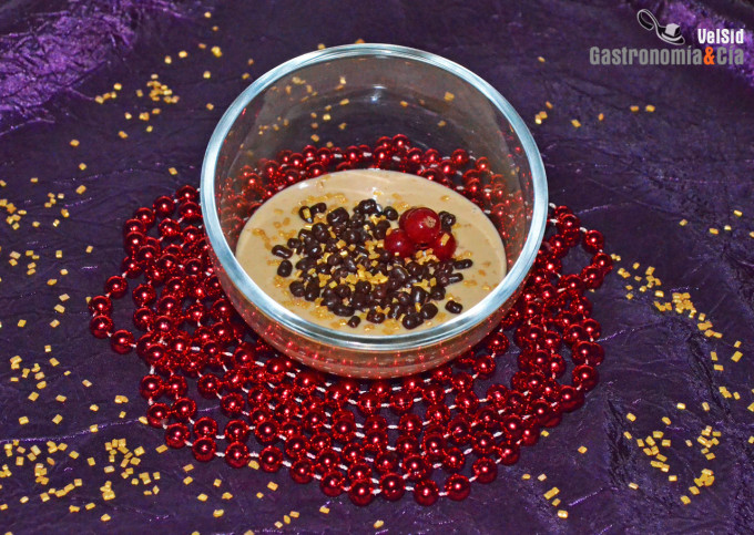 Sirve la crema de turrón ligera en vasitos o cuencos pequeños, bastará con unos 75 gramos aproximadamente. Puedes decorar este postre con unas bolitas crujientes de chocolate sin azúcar y con unas grosellas, con unos barquillos, etc.