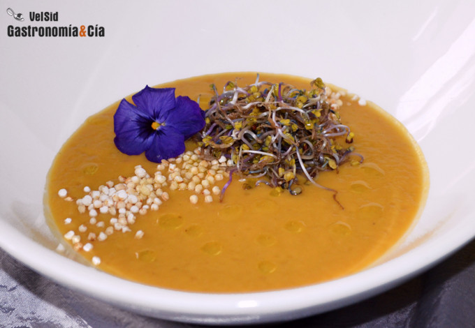 Crema de puerro y boniato con quinoa y germinados