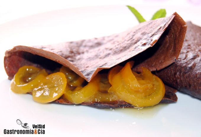 No nos cansamos de nombrar las virtudes de una legumbre tan humilde como los garbanzos, ¿recordáis que no hace mucho tiempo compartíamos con vosotros la receta de hummus de chocolate?, también es una sorpresa para los paladares más golosos y un regalo para sumar nutrientes beneficiosos para nuestra salud. Estas crepes de chocolate las podéis preparar para servir como desayuno, postre o merienda, y rellenarlas con la fruta de temporada que más os guste, acompañarlas con nata, regarlas con salsa de chocolate… en esta ocasión las hemos acompañado con limequats confitados, deliciosa combinación chocolate y limón…