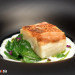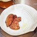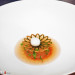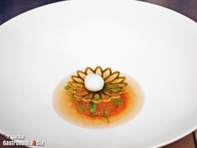 La parpatana es la parte elegida para realizar la técnica del secado, cocinada a baja temperatura, desmigada y utilizada como farsa de un dumpling que elaboran con el trigo que se cultiva en su territorio. También secan y ahúman la espina del pescado para hacer un caldo dashi, y aprovechan el alga kombu de la preparación anterior que ya ha absorbido la humedad (y el sabor) del pescado. El dumpling de parpatana de lubina se presenta con un crujiente de trigo, el dashi y una esferificación de colágeno del pescado, la presentación es bella, pero la degustación seguro que la supera.
