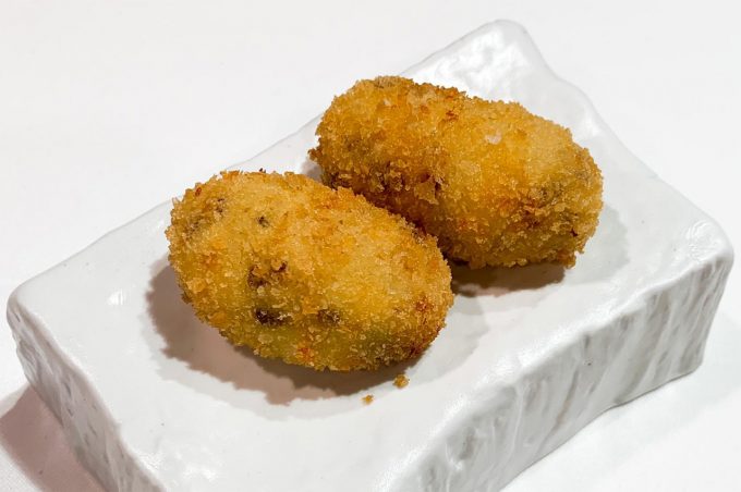 Bolear las croquetas haciendo porciones de 30 a 32 gramos de bechamel cuajada y pasar por huevo batido primero, y por panko (pan rallado japonés) después, al ser más grueso, queda más crujiente. Freír en aceite bien caliente, a unos 190-200º C.