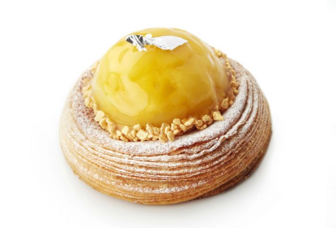 Disponer la placa de mantequilla avellana sobre la masa de cruasán, y realizar un pliegue simple y uno doble. Dejar reposar en cámara durante 2 horas. Transcurrido este tiempo, laminar a 6 mm de grosor. Con ayuda de cortapastas de 10 cm y de 5 cm de diámetro, cortar piezas en forma de ‘donut’ y depositar una semiesfera de manzana impregnada con mango congelada en el centro. Hornear a 168ºC durante 18 minutos sin fermentación previa. Reservar hasta el acabado.