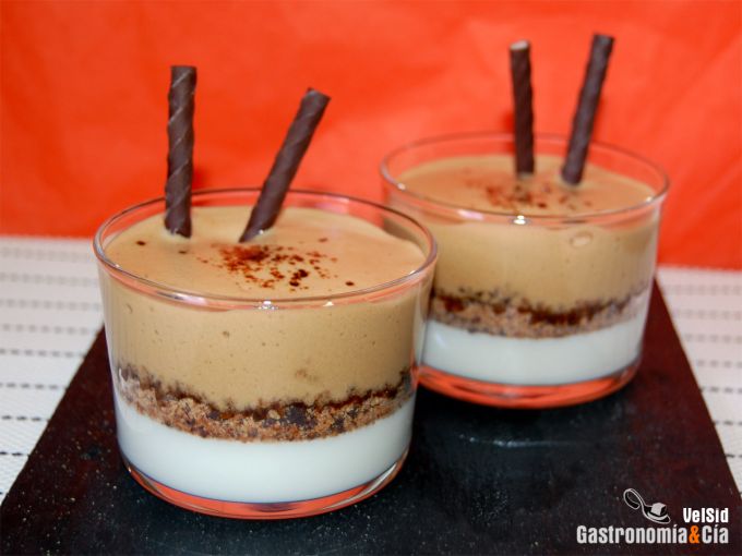 La combinación de sabores está genial, café, chocolate, galleta y leche, siempre podéis hacer algunos cambios como por ejemplo poner unas natillas espesas en lugar de la cuajada, o la gelatina de chocolate también le irá ideal. A vuestro gusto.