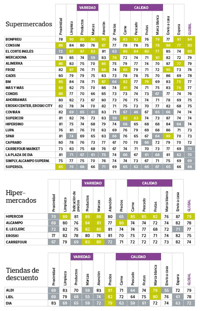 De los cinco hipermercados propuestos, como hemos comentado, el más valorado por su variedad y calidad es Hipercor, le sigue Alcampo, E. Leclerc, Eroski y Carrefour (poco coincidiría si la encuesta se realizara en nuestra ciudad). Mientras que entre las tres cadenas de tiendas de descuento, el orden de preferencia de los consumidores son Aldi, Lidl y Día. Ya veis que los consumidores han valorado lo antes comentado, la proximidad, la limpieza, la variedad de productos y de marcas, la atención, los precios, y la calidad de carnes, pescados, frutas y marca blanca, además de la posibilidad de envío a casa y el tiempo de espera en la caja.