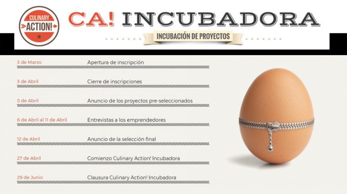 La convocatoria de la cuarta edición de Culinary Action! Incubator está abierta desde el pasado viernes y el plazo de inscripciones finalizará el 3 de abril, y es que el programa de dos meses de duración está programado para desarrollarse del 27 de abril al 29 de junio de 2017. De todas las inscripciones recibidas, se anunciará cuáles son los proyectos pre-seleccionados el 5 de abril, entre el 6 y el 11 de abril se realizarán entrevistas a los emprendedores de estos proyectos, y el 12 de abril se dará a conocer la selección final de la cuarta edición de este programa, serán diez equipos.