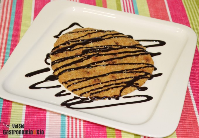 Como os comentábamos, las medidas de los ingredientes para hacer esta galleta gigante son a ojo, pues aunque se indiquen cucharadas, se utiliza una cuchara sopera y no hay nada de precisión, pero aun siendo así hay posibilidad de que salga una galleta comestible. Lo que sí es seguro es que después de probar la primera, la segunda saldrá mejor, pues se podrá perfeccionar el equilibrio de sabores.
